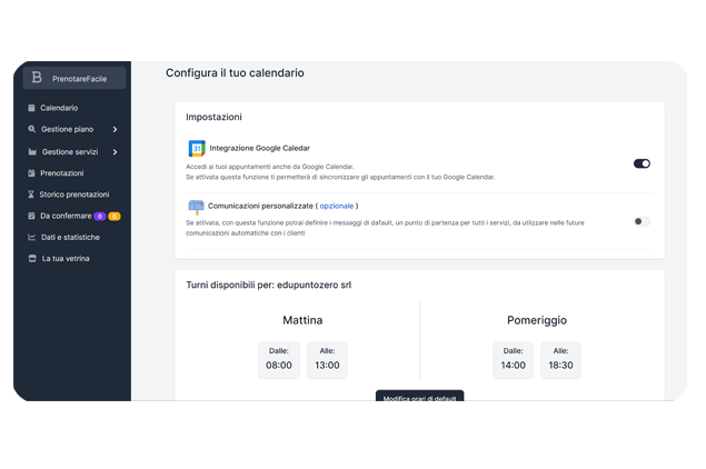 Prenotare Facile ti permette di personalizzare la tua pagina di prenotazioni, di gestire comunicazioni personalizzate e di organizzare le tue prenotazioni in tutti i modi possibili. E se trovi qualcosa che vorresti funzionasse diversamente scrivici pure, il nostro team di sviluppatori prenderà in carico tutte le tue richieste!